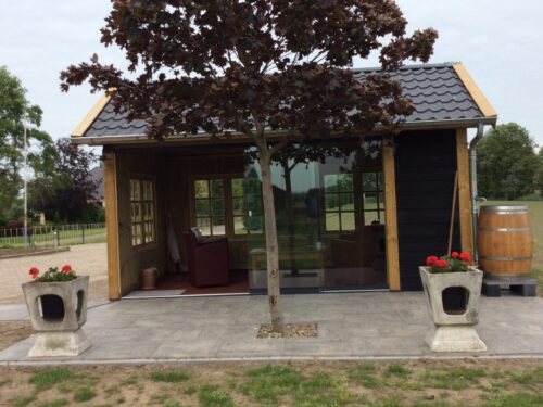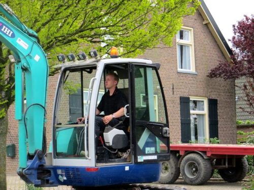 Voorgevel beplating aan brengen door Kees de vrouw kijkt toe